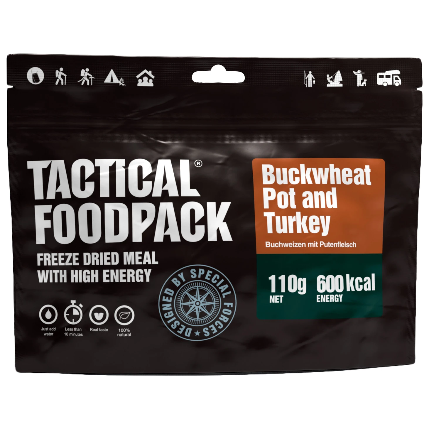 Mit dem gefriergetrockneten Hauptgericht Buckwheat and Turkey von Tactical Foodpack hat man in der Wildnis oder in den Bergen ein leckeres Mittagessen oder Abendessen mit dabei.